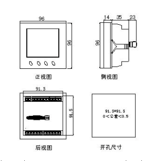 外形尺寸:96mm×96mm×72mm 开孔尺寸:91.5mm×91.5mm 安装深度:≥58mm
